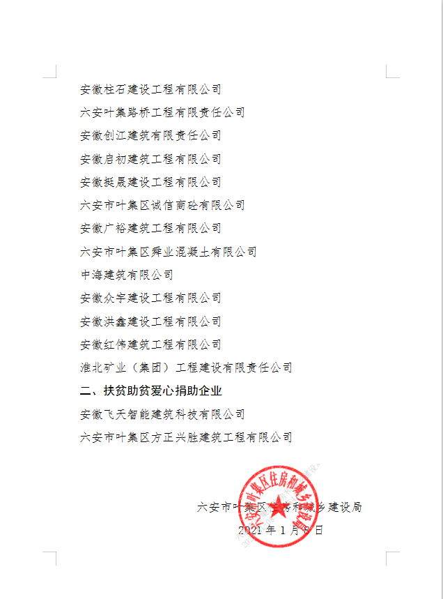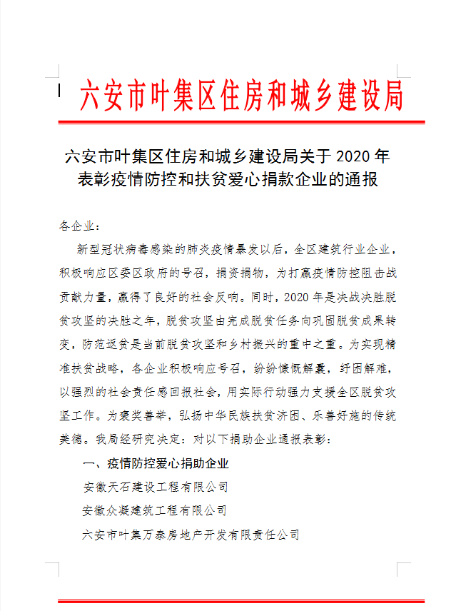 六安市葉集區關于2020年表彰疫情防控和扶貧愛心捐款企業的通知
