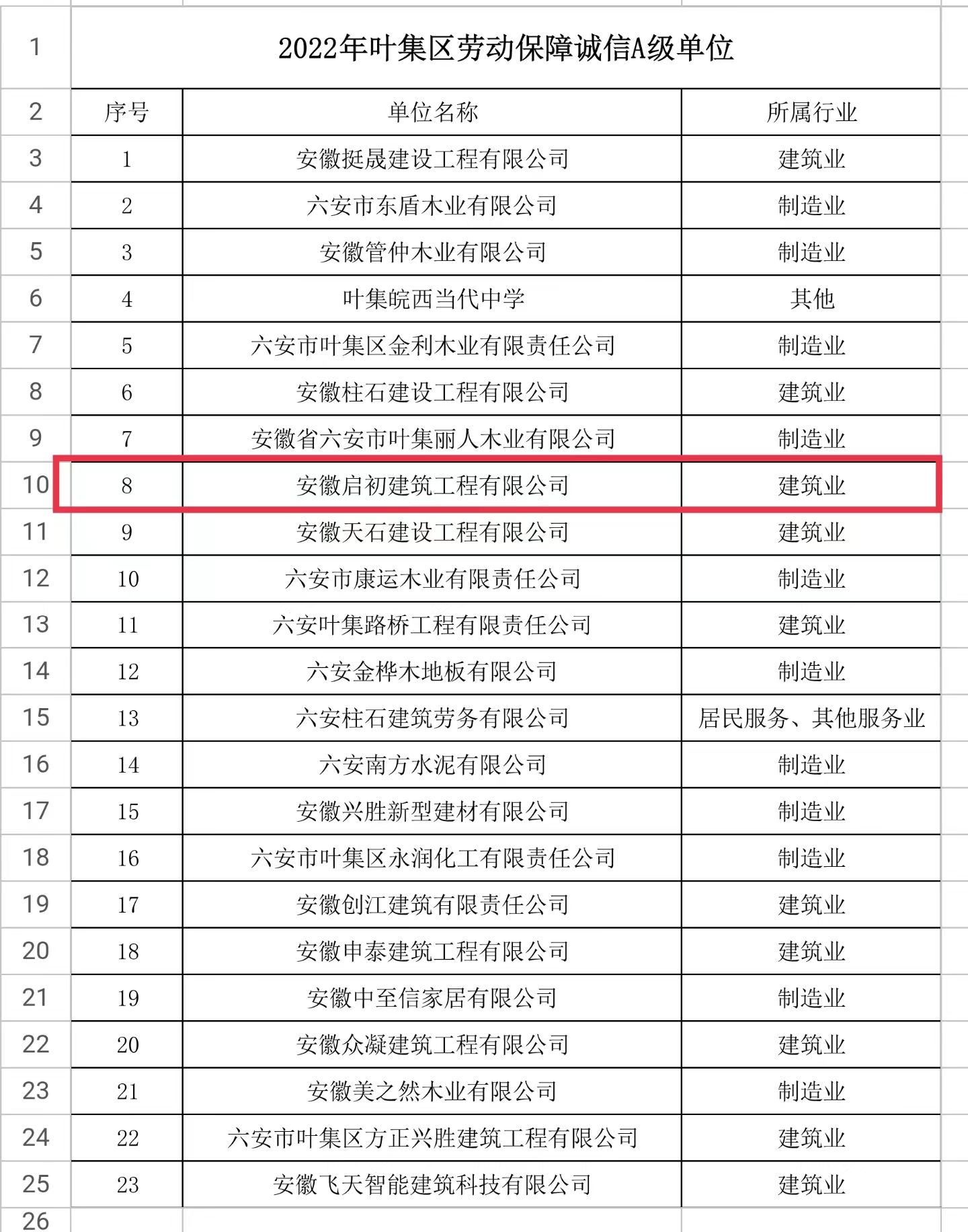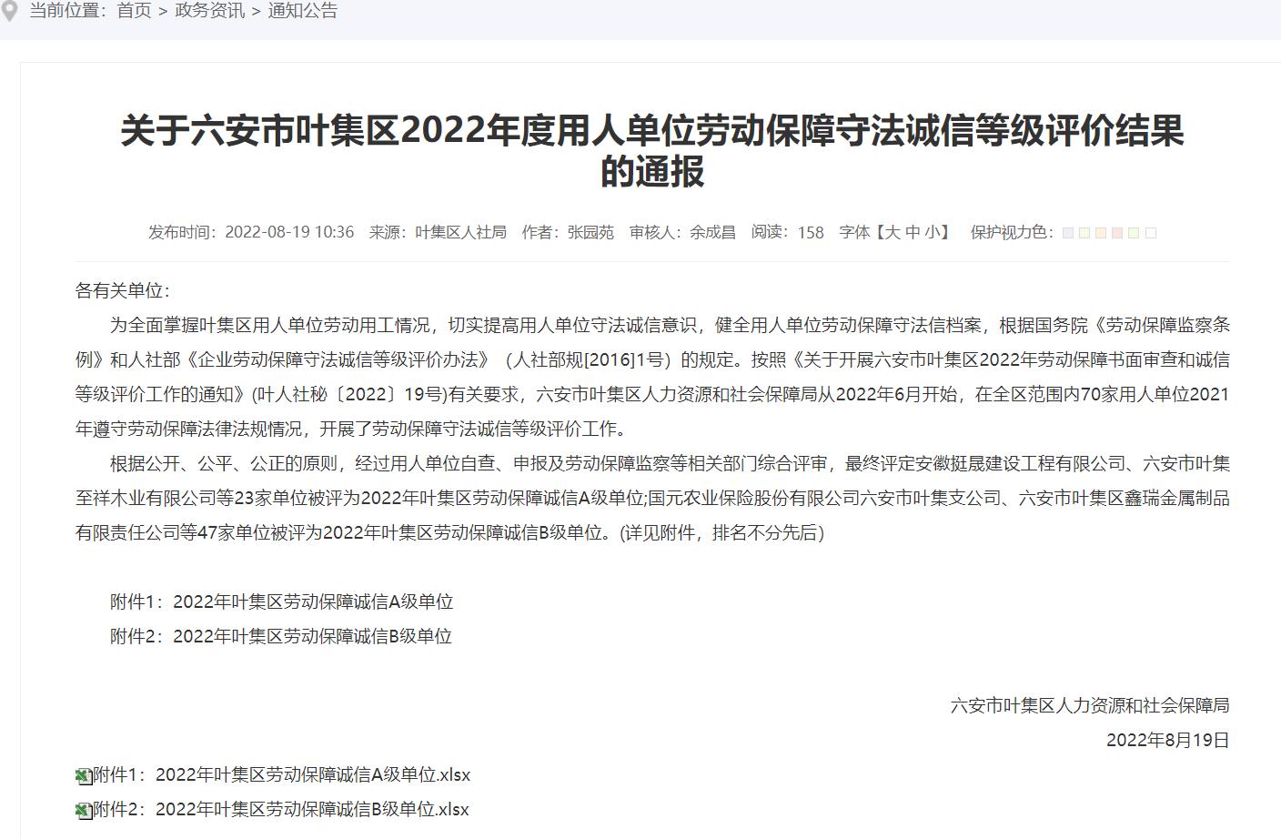 公司榮獲六安市葉集區(qū)2022年度用人單位勞動保障守法誠信等級評價A級單位