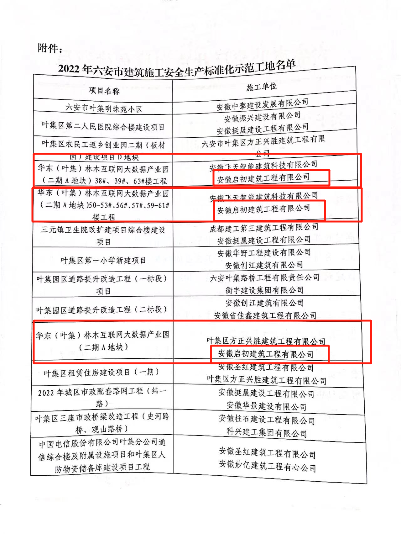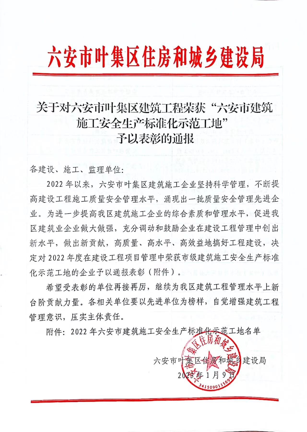 關于對六安市葉集區建筑工程榮獲“六安市建筑施工安全生產標準化示范工地”予以表彰的通報
