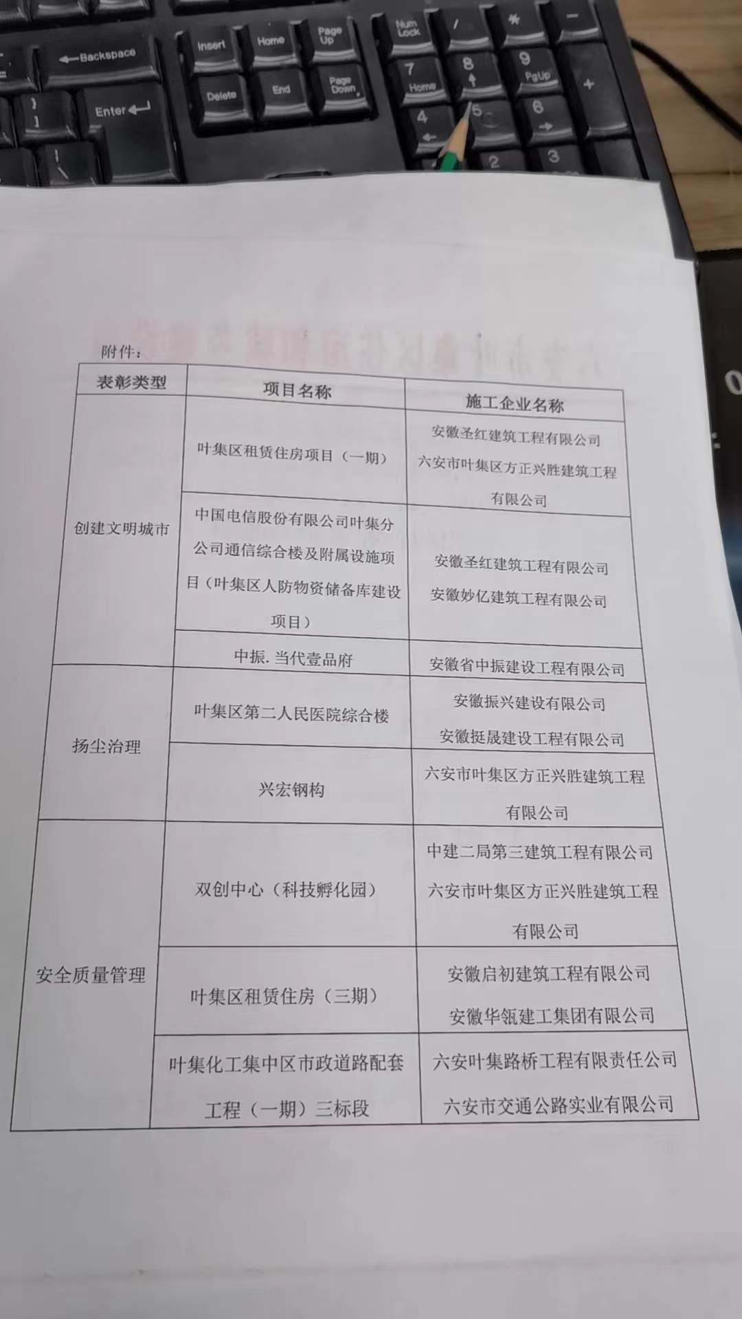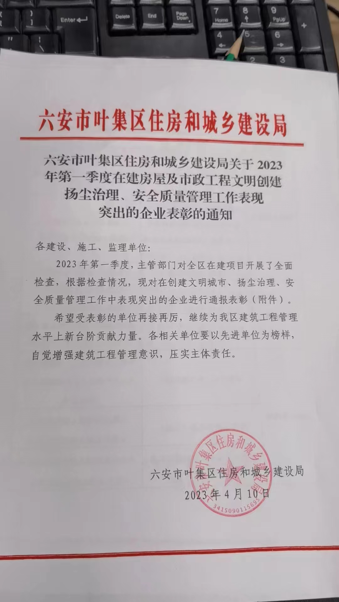公司項(xiàng)目在葉集區(qū)住建局第一季度在建房屋檢查中被授予安全質(zhì)量管理工作表現(xiàn)突出的表彰