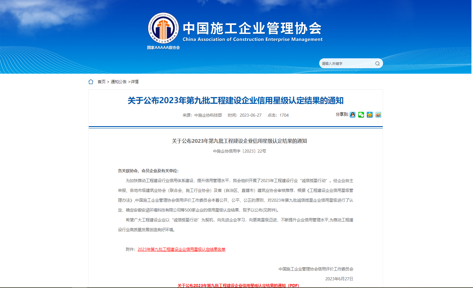 公司榮獲中國施工企業管理協會2023年工程建設企業信用5星級認定