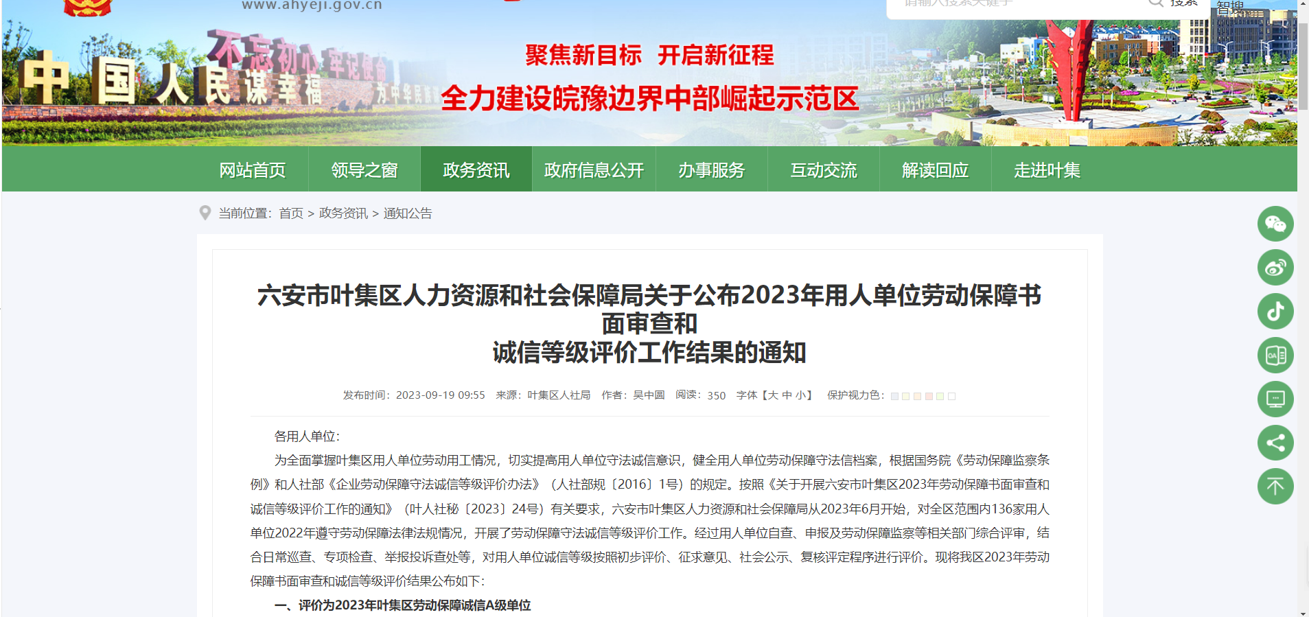 公司榮獲六安市葉集區2023年度用人單位勞動保障守法誠信等級評價A級單位